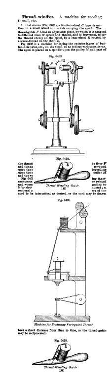 Thread Winder, ---. Knight's American Mechanical Dictionary, 1876, 1 page. Posted September 12, 2003. SAMPLE PAGE. File size 432 KB PDF