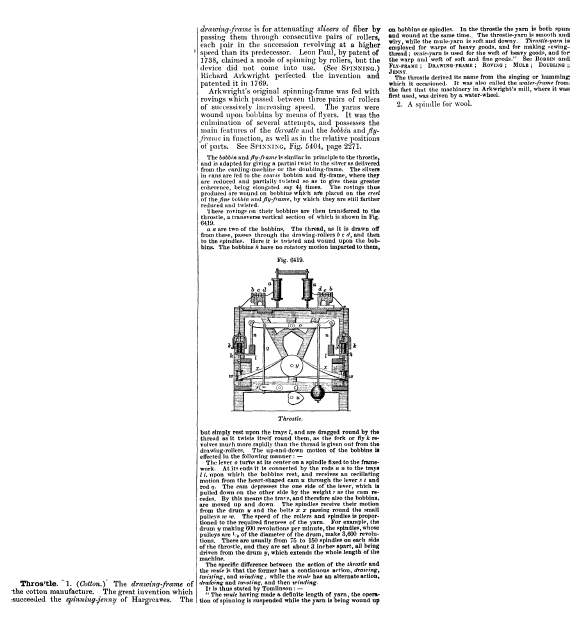 Throstle, ---. Knight's American Mechanical Dictionary, 1876, 1 page. Posted September 13, 2003. SAMPLE PAGE. File size 476KB PDF