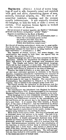 Tapestry, ---. Knight's American Mechanical Dictionary, 1876, 1 page. Posted September 13, 2003. SAMPLE PAGE. File size 452 KB PDF