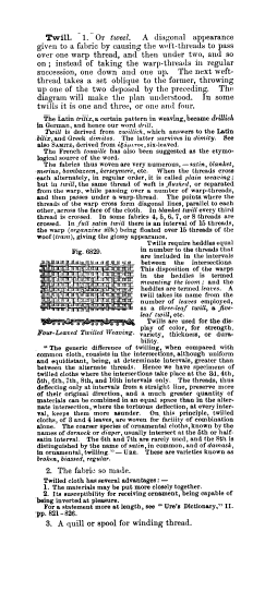 Twill, ---. Knight's American Mechanical Dictionary, 1876, 1 page. Posted September 13, 2003. SAMPLE PAGE. File size 456 KB PDF