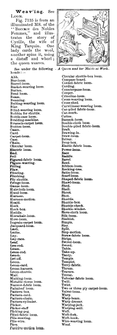 Weaving, ---. Knight's American Mechanical Dictionary, 1876, 1 page. Posted September 13, 2003. SAMPLE PAGE. File size 436 KB PDF