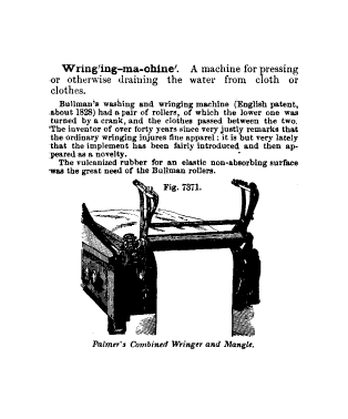 Wringing Machine, ---. Knight's American Mechanical Dictionary, 1876, 1 page. Posted September 26, 2004. SAMPLE PAGE. File size 408 KB PDF