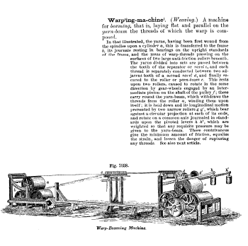 Warping Machine, ---. Knight's American Mechanical Dictionary, 1876, 1 page. Posted September 14, 2003. SAMPLE PAGE. File size 444 KB PDF