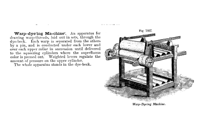 Warp Dyeing Machine, ---. Knight's American Mechanical Dictionary, 1876, 1 page. Posted September 14, 2003. SAMPLE PAGE. File size 432 KB PDF