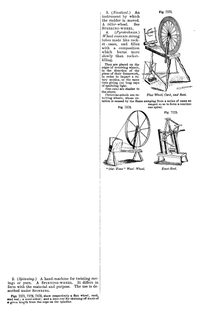 Spinning Wheel, ---. Knight's American Mechanical Dictionary, 1876, 1 page. Posted September 11, 2003. SAMPLE PAGE. File size 448 KB PDF