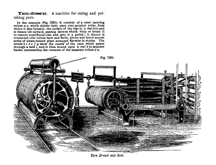 Yarn Dresser, ---. Knight's American Mechanical Dictionary, 1876, 1 page. Posted September 14, 2003. SAMPLE PAGE. File size 488 KB PDF