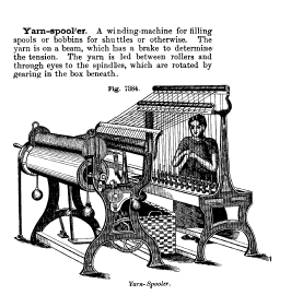 Yarn Spooler, ---. Knight's American Mechanical Dictionary, 1876, 1 page. Posted September 14, 2003. SAMPLE PAGE. File size 440 KB PDF