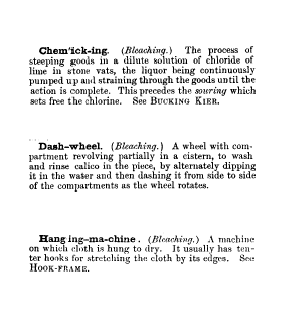 Bleaching, ---. Knight's American Mechanical Dictionary, 1876, 1 page. Posted August 13, 2003. SAMPLE PAGE. File size 508 KB PDF
