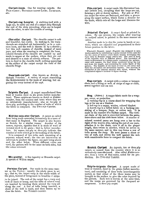 Carpet, ---. Knight's American Mechanical Dictionary, 1876, 2 pages. Posted September 3, 2003. SAMPLE PAGE. File size 576 KB PDF