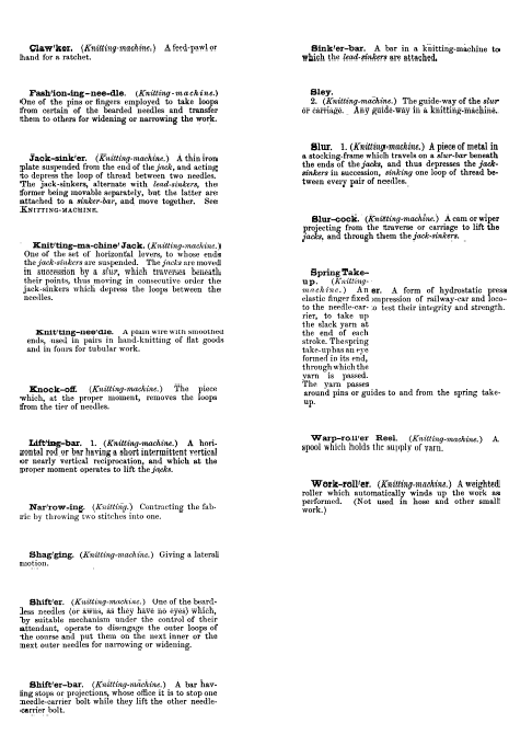 [Yarn], ---. Knight's American Mechanical Dictionary, 1876, 2 pages. Note: Collected short articles. Posted August 9, 2004. SAMPLE PAGE. File size 444 KB PDF