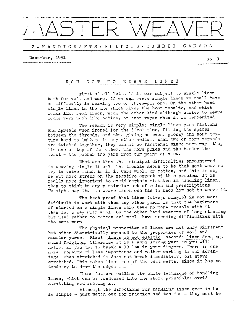 How Not to Weave Linen, ---. Master Weaver, No. 1 December 1951, 5 pages. Note: PDF provided by Judith Combs. By permission. Posted July 15, 2006. SAMPLE PAGE. File size 970 KB PDF