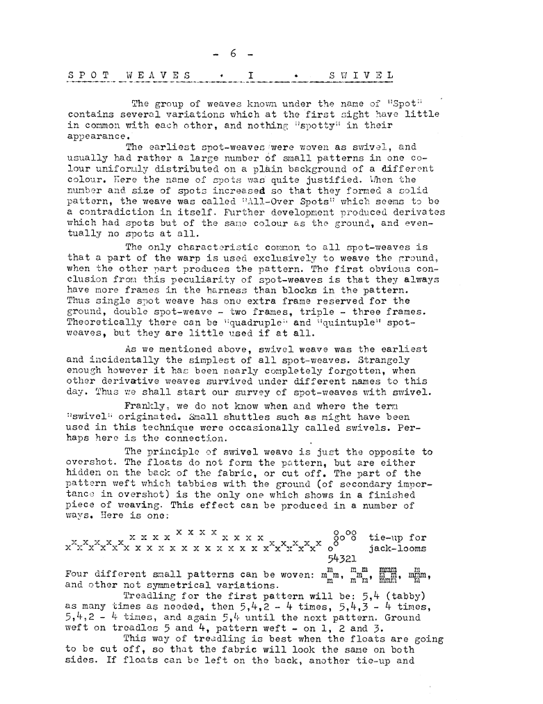 Spot Weaves - 1 (Swivel), ---. Master Weaver, No. 1 December 1951, 3 pages. Note: PDF provided by Judith Combs. By permission. Posted July 15, 2006. SAMPLE PAGE. File size 690 KB PDF