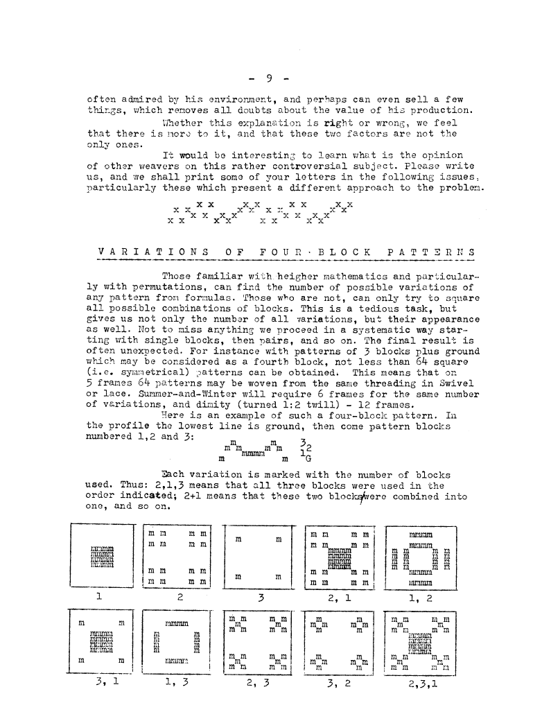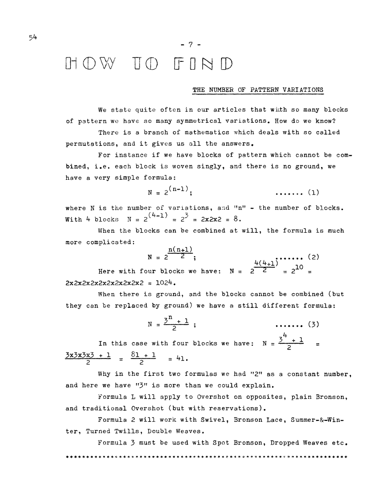How to Find the Number of Pattern Variations, ---. Master Weaver, No. 54 November 1960, 1 page. Note: PDF provided by Judith Combs. By permission. Posted July 15, 2006. SAMPLE PAGE. File size 456 KB PDF