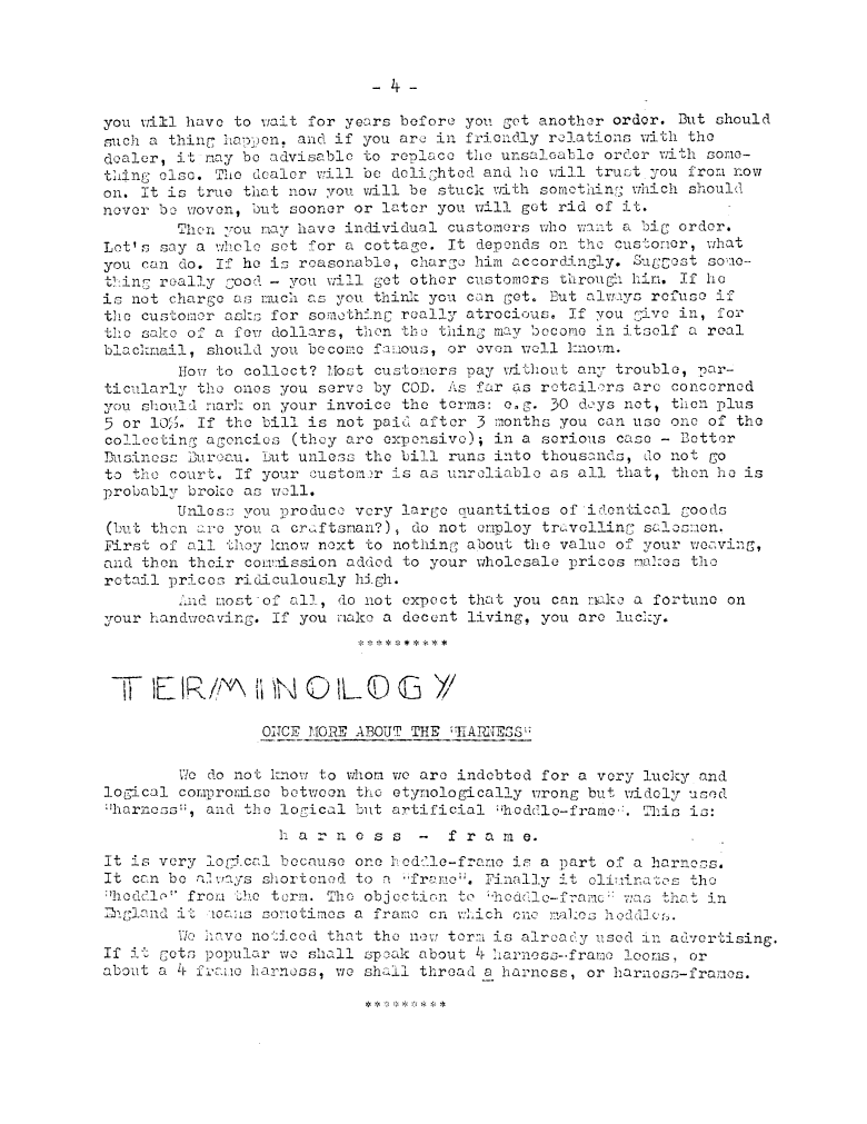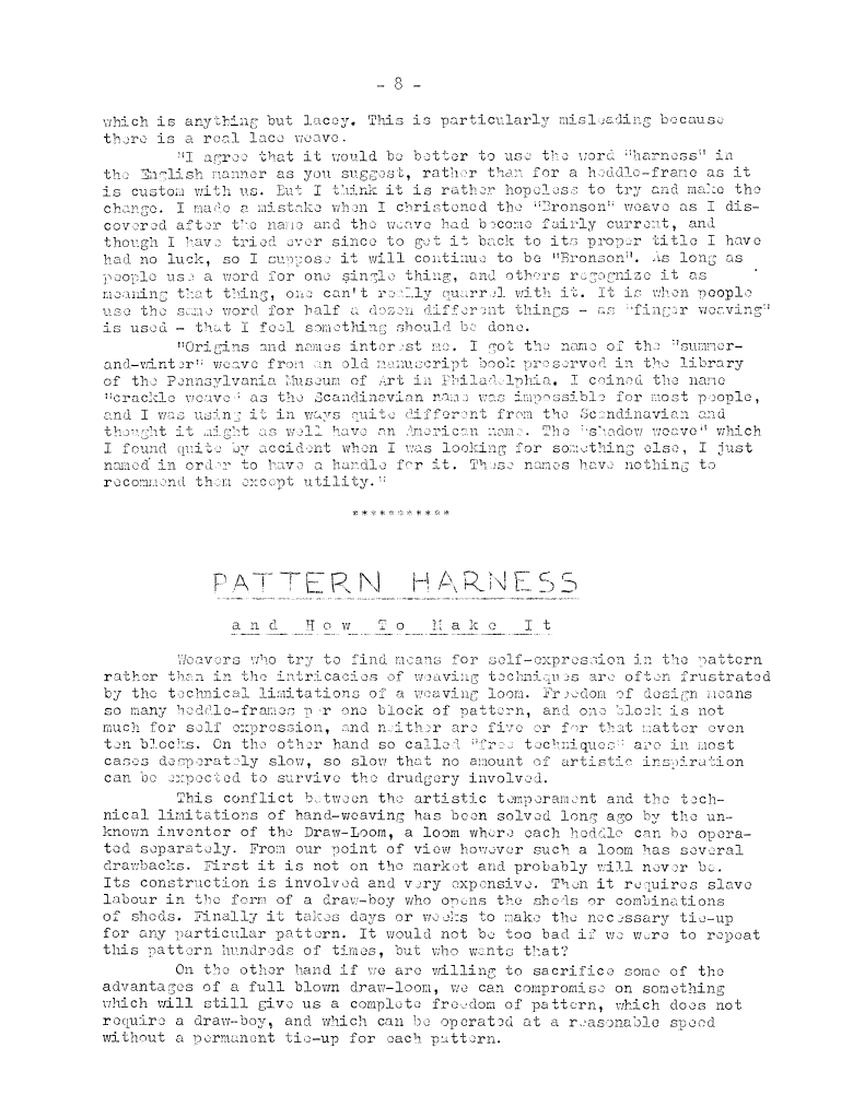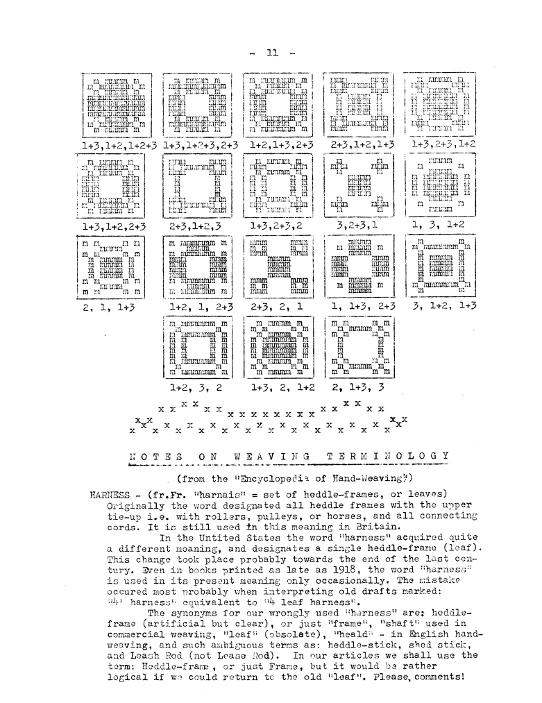 Weaving Terminology - Harness, ---. Master Weaver, No. 1 December 1951, 1 page. Note: PDF provided by Judith Combs. By permission. Posted July 15, 2006. SAMPLE PAGE. File size 535 KB PDF