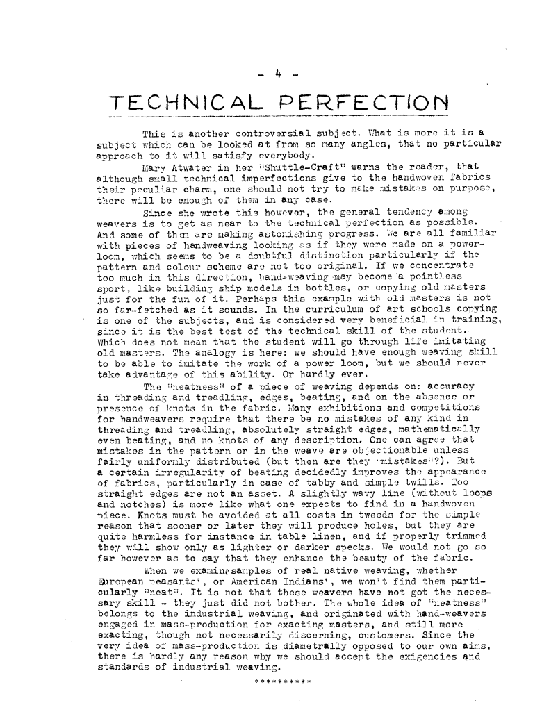 Technical Perfection, ---. Master Weaver, No. 2 February 1952, 1 page. Note: PDF provided by Judith Combs. By permission. Posted July 15, 2006. SAMPLE PAGE. File size 559 KB PDF