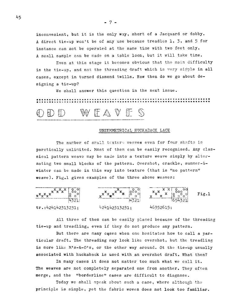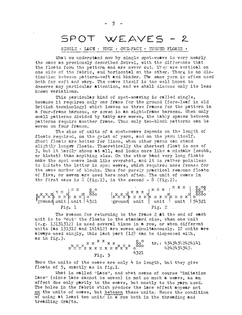 Spot Weaves 2 (spot, lace, turned), ---. Master Weaver, No. 2 February 1952, 3 pages. Note: PDF provided by Judith Combs. By permission. Posted July 15, 2006. SAMPLE PAGE. File size 777 KB PDF