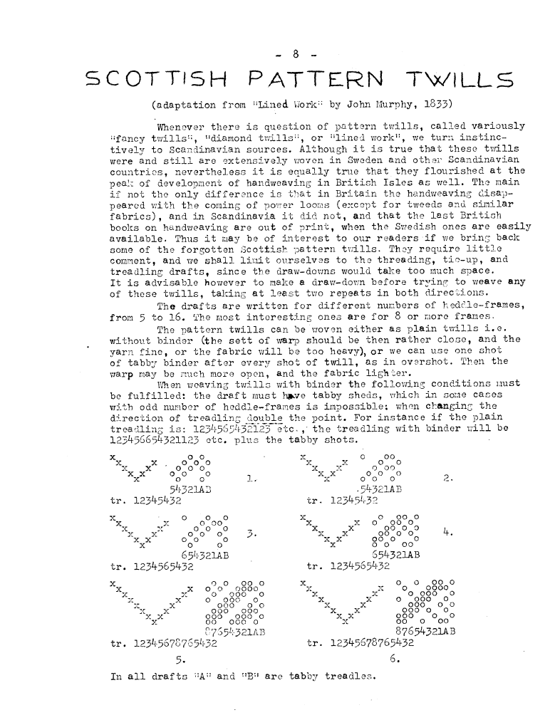 Scottish Pattern Twills, Murphy. John. Master Weaver, No. 2 February 1952, 3 pages. Note: PDF provided by Judith Combs. By permission. Posted July 15, 2006. SAMPLE PAGE. File size 619 KB PDF