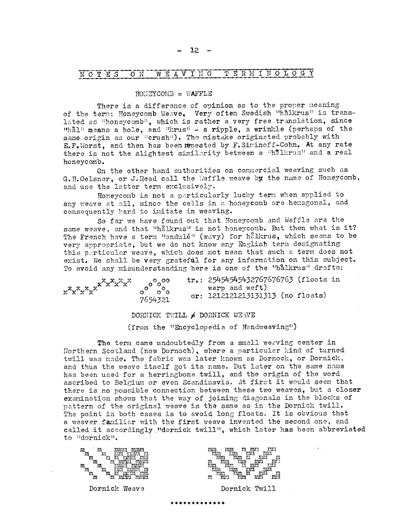 Weaving Terminology Honeycomb-Waffle, Dornick, ---. Master Weaver, No. 2 February 1952, 1 page. Note: PDF provided by Judith Combs. By permission. Posted July 15, 2006. SAMPLE PAGE. File size 512 KB PDF