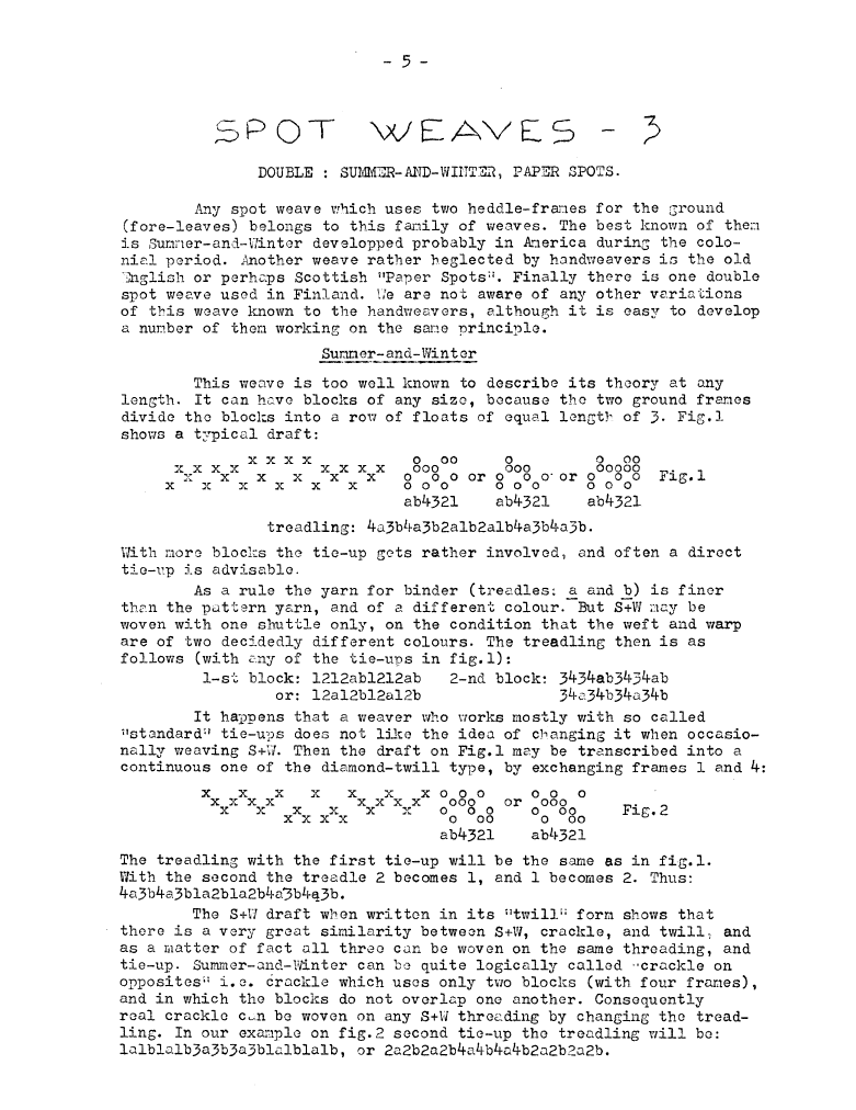 Spot Weaves 3 - Double: Summer-and-Winter, Paper Spots, ---. Master Weaver, No. 3 April 1952, 3 pages. Note: PDF provided by Judith Combs. By permission. Posted July 15, 2006. SAMPLE PAGE. File size 741 KB PDF