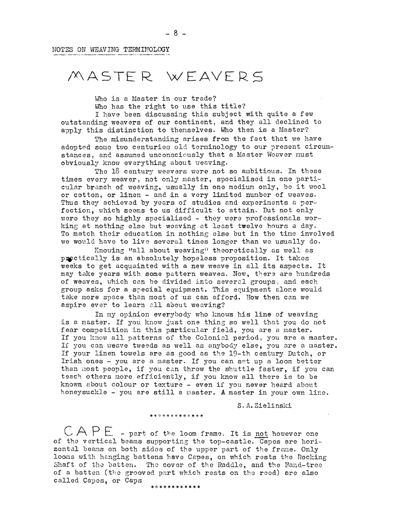 Weaving Terminology - Master Weavers, Cape, ---. Master Weaver, No. 3 April 1952, 1 page. Note: PDF provided by Judith Combs. By permission. Posted July 15, 2006. SAMPLE PAGE. File size 485 KB PDF
