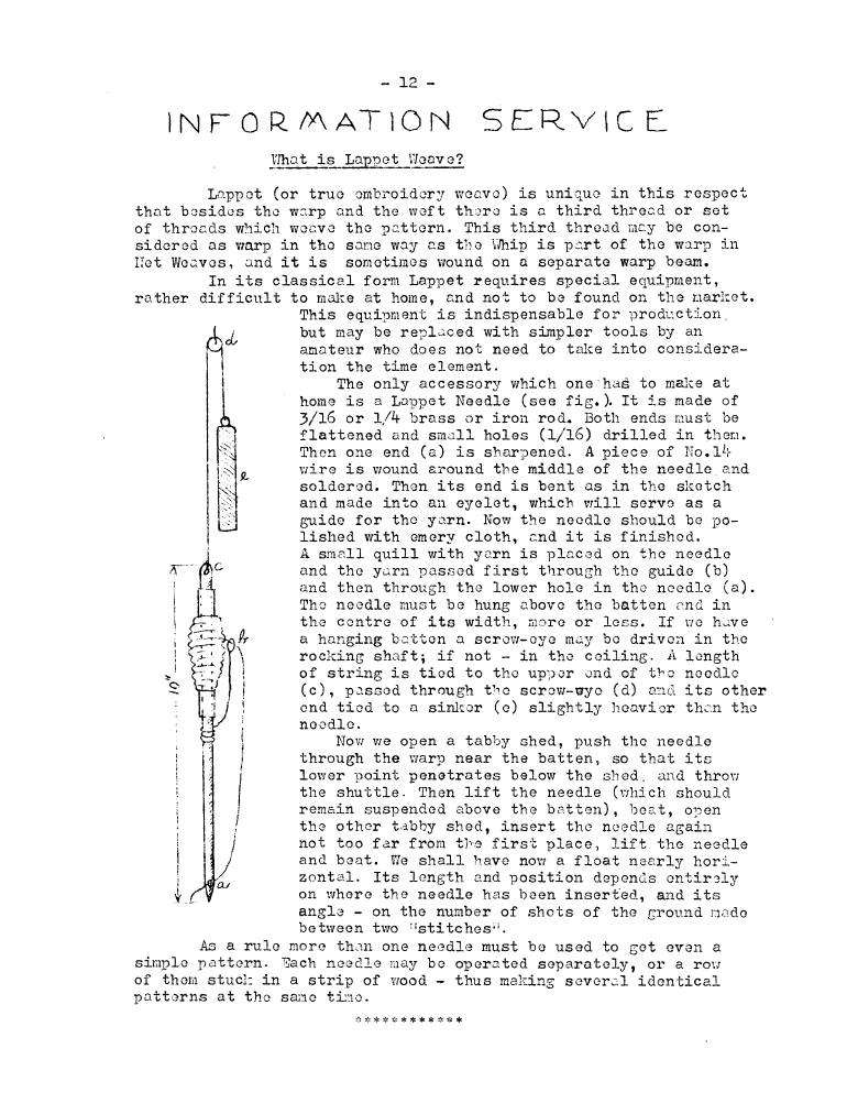 Information Service - What Is Lappet Weave?, ---. Master Weaver, No. 3 April 1952, 1 page. Note: PDF provided by Judith Combs. By permission. Posted July 15, 2006. SAMPLE PAGE. File size 479 KB PDF