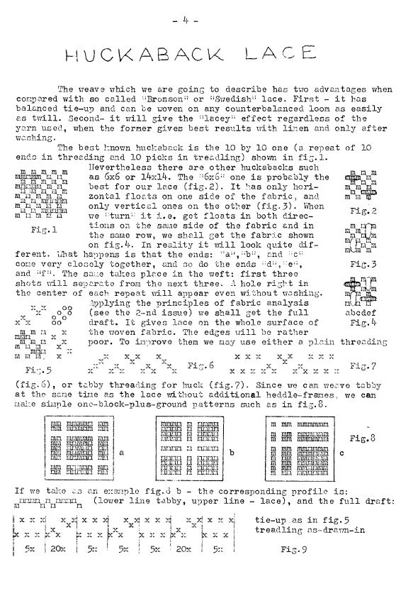 Huckaback Lace, ---. Master Weaver , June 1952, 3 pages. Note: PDF provided by Maury Logue. Posted July 7, 2006. SAMPLE PAGE. File size 678 KB PDF