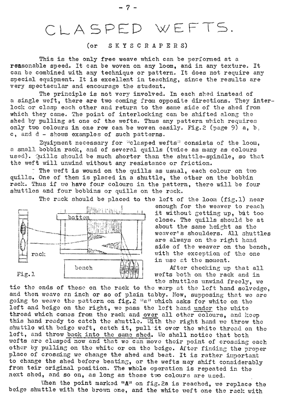 Clasped Wefts (or Skyscrapers), ---. Master Weaver , June 1952, 3 pages. Note: PDF provided by Maury Logue. Posted July 7, 2006. SAMPLE PAGE. File size 772 KB PDF