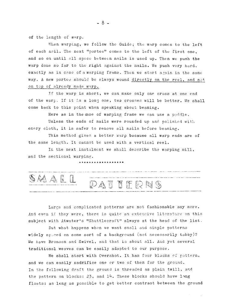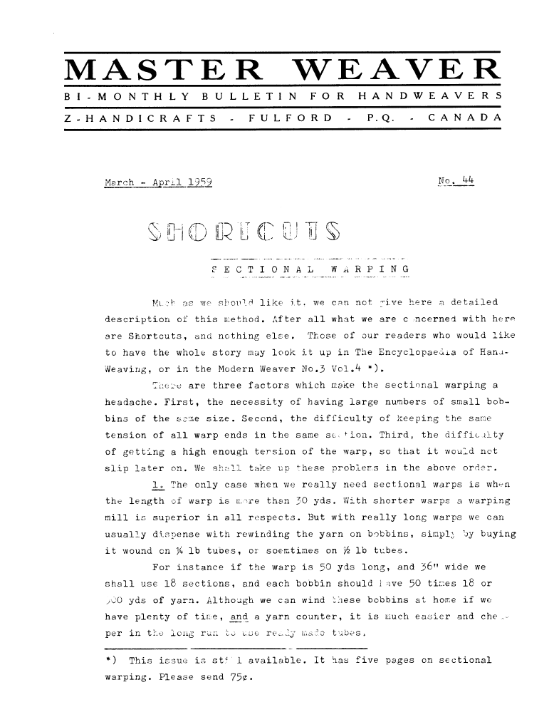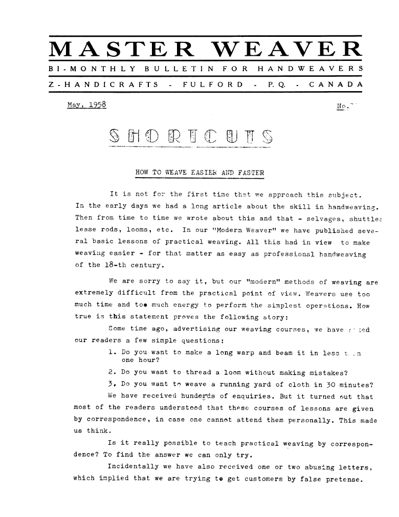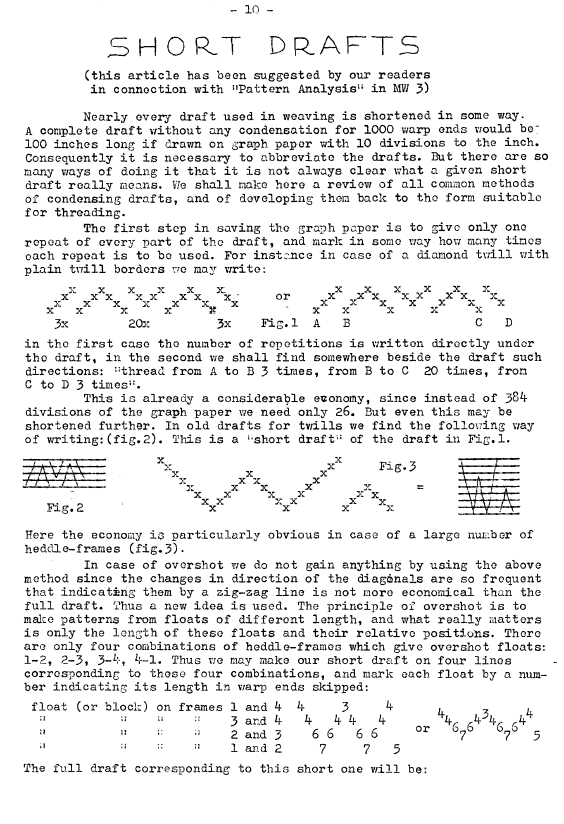 Short Drafts, ---. Master Weaver , June 1952, 3 pages. Note: PDF provided by Maury Logue. Posted July 7, 2006. SAMPLE PAGE. File size 663 KB PDF
