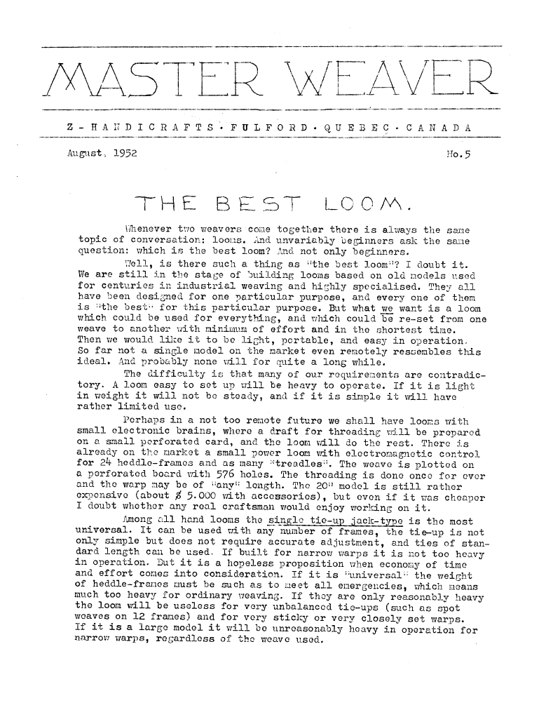 The Best Loom, ---. Master Weaver, No. 5 August 1952, 4 pages. Note: PDF provided by Judith Combs. By permission. Posted July 15, 2006. SAMPLE PAGE. File size 807 KB PDF
