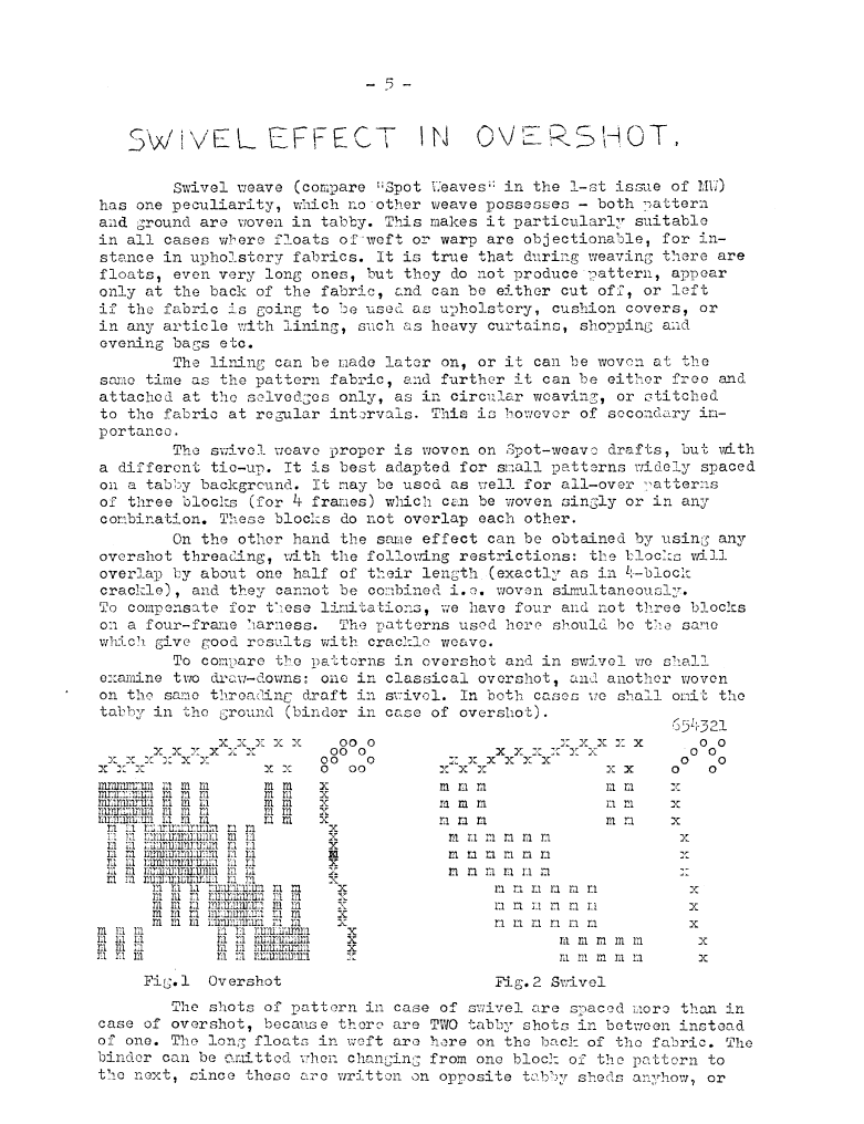 Swivel Effect in Overshot, ---. Master Weaver, No. 5 August 1952, 3 pages. Note: PDF provided by Judith Combs. By permission. Posted July 15, 2006. SAMPLE PAGE. File size 666 KB PDF