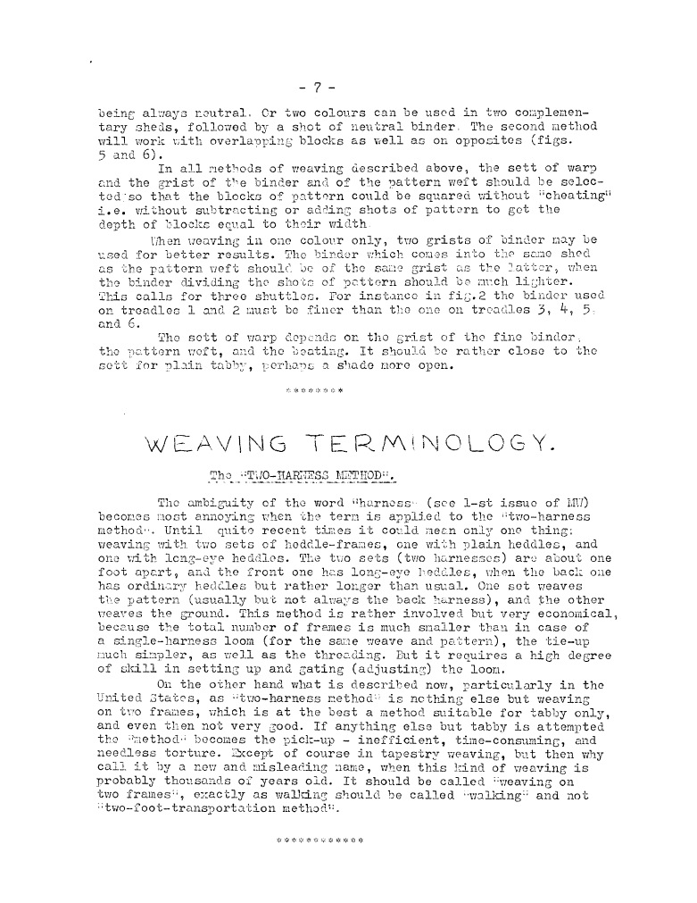 Weaving Terminology - The Two Harness Method, ---. Master Weaver, No. 5 August 1952, 1 page. Note: PDF provided by Judith Combs. By permission. Posted July 15, 2006. SAMPLE PAGE. File size 486 KB PDF