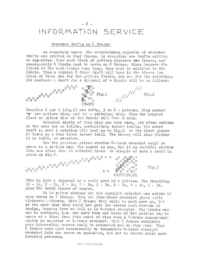 Information Service - Overshot Drafts on 8 Frames, ---. Master Weaver, No. 5 August 1952, 1 page. Note: PDF provided by Judith Combs. By permission. Posted July 15, 2006. SAMPLE PAGE. File size 476 KB PDF