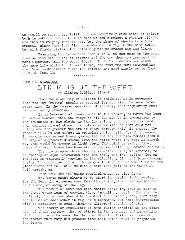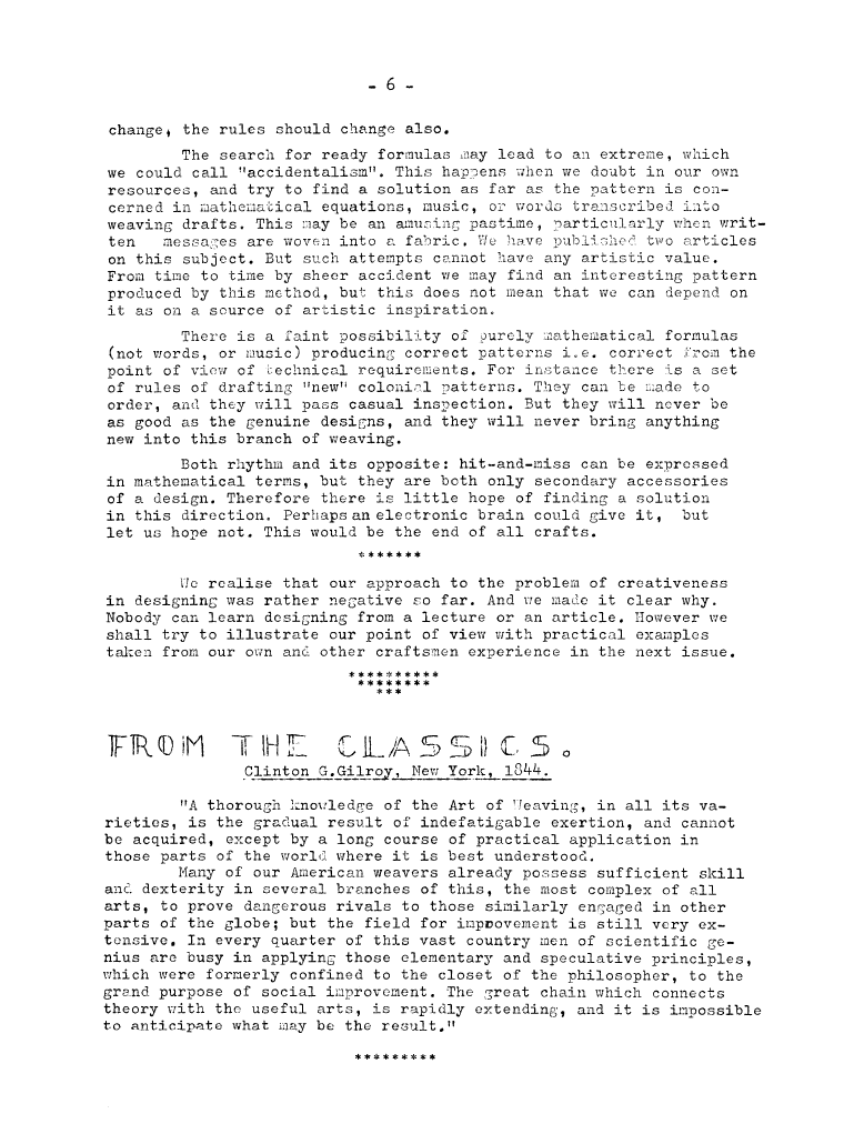 From the Classics: Striking up the Weft (1844), Gilroy, Clinton G. Master Weaver, No. 5 August 1952, 1 page. Note: PDF provided by Judith Combs. By permission. Posted July 15, 2006. SAMPLE PAGE. File size 492 KB PDF