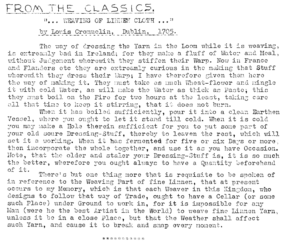 From the Classics - Weaving of Linnen Cloth 1705, Crommolin, Louis. Master Weaver , October 1952, 1 page. Note: PDF provided by Maury Logue. Posted July 7, 2006. SAMPLE PAGE. File size 522 KB PDF