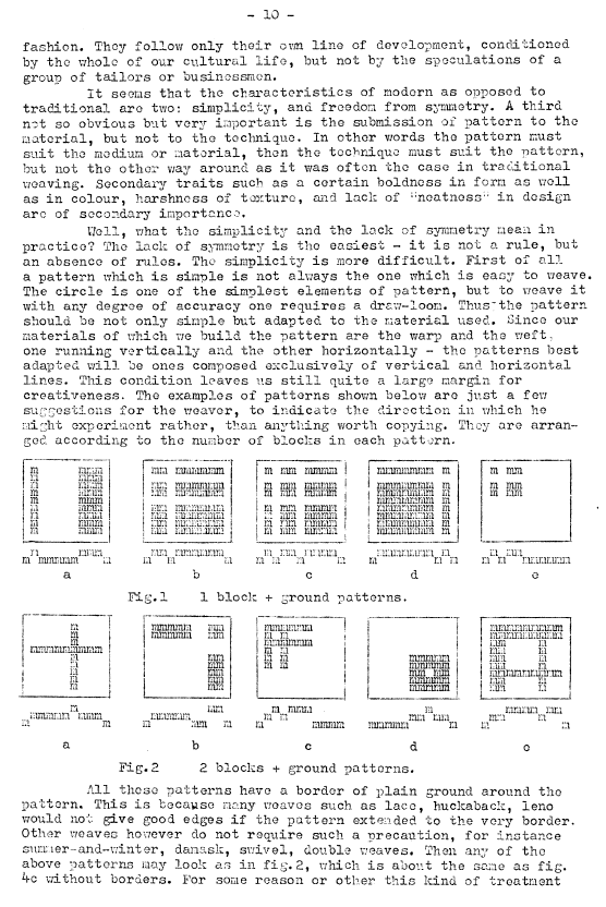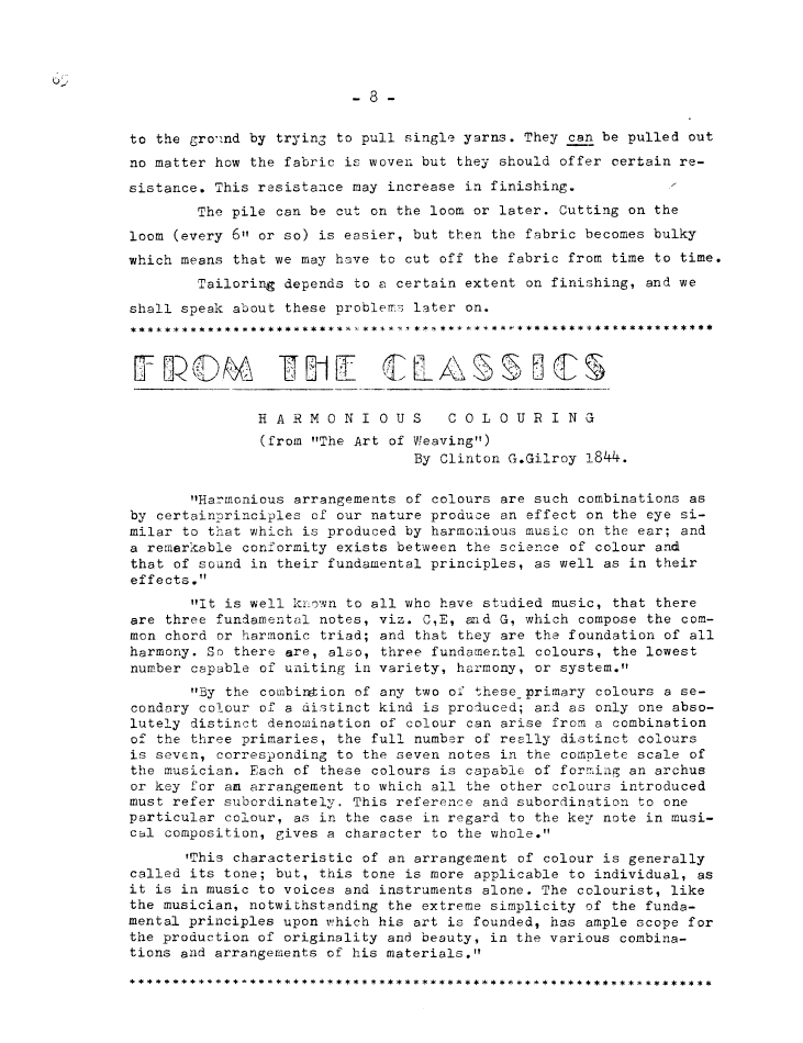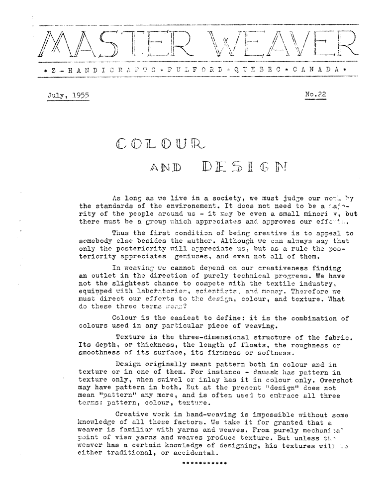 Colour and Design, ---. Master Weaver, No. 22 July 1955, 6 pages. Note: PDF provided by Judith Combs. By permission. Posted July 15, 2006. SAMPLE PAGE. File size 1 MB PDF