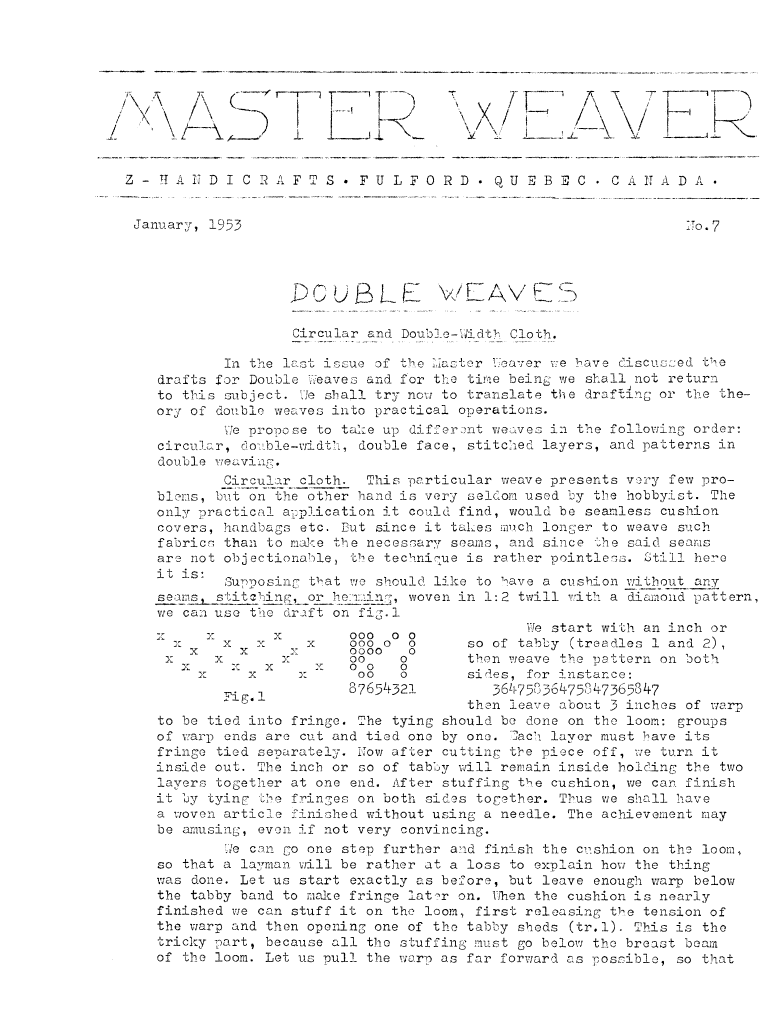 Double Weaves - Circular and Double-Width Cloth, ---. Master Weaver, No. 7 January 1953, 4 pages. Note: PDF provided by Judith Combs. By permission. Posted July 15, 2006. SAMPLE PAGE. File size 864 KB PDF