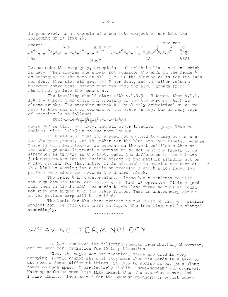 Weaving Terminology, Atwater, Mary M. Master Weaver, No. 7 January 1953, 2 pages. Note: PDF provided by Judith Combs. By permission. Posted July 15, 2006. SAMPLE PAGE. File size 599 KB PDF
