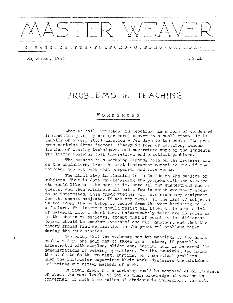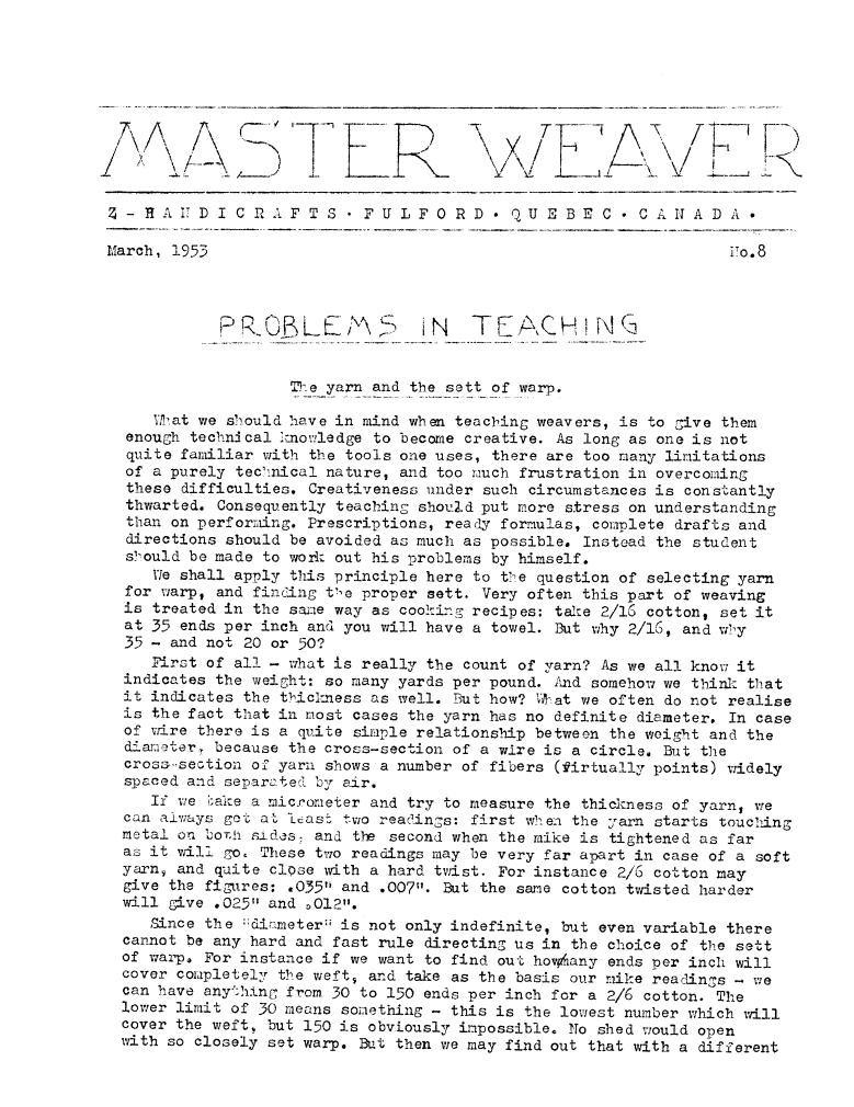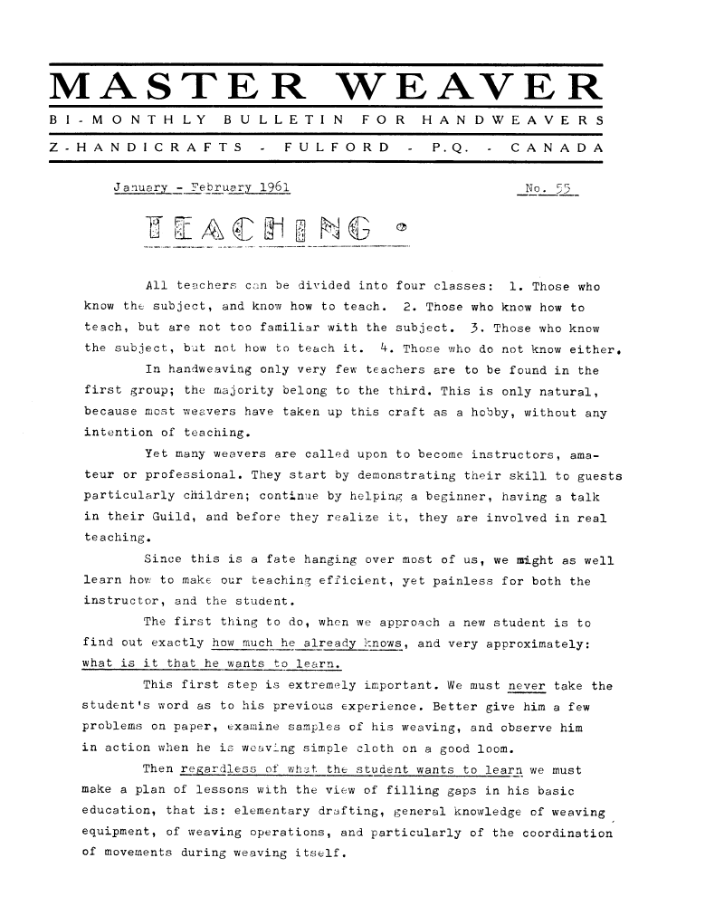 Teaching, ---. Master Weaver, No. 55 January 1961, 4 pages. Note: PDF provided by Judith Combs. By permission. Posted July 15, 2006. SAMPLE PAGE. File size 716 KB PDF