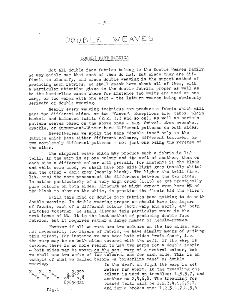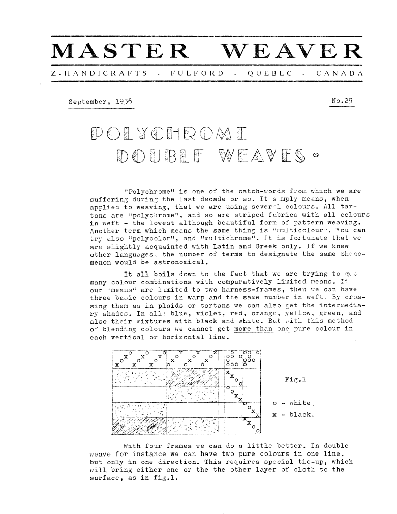 Drafts for Double Weaves, ---. Master Weaver , October 1952, 5 pages. Note: PDF provided by Maury Logue. Posted July 7, 2006. SAMPLE PAGE. File size 2.54 MB PDF