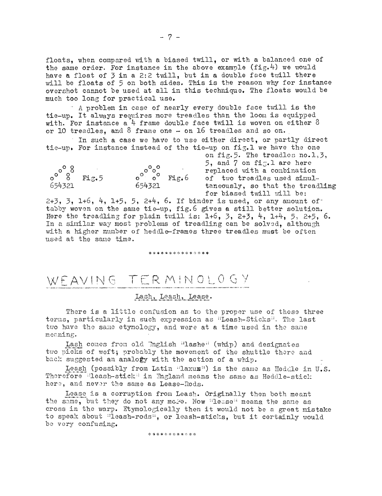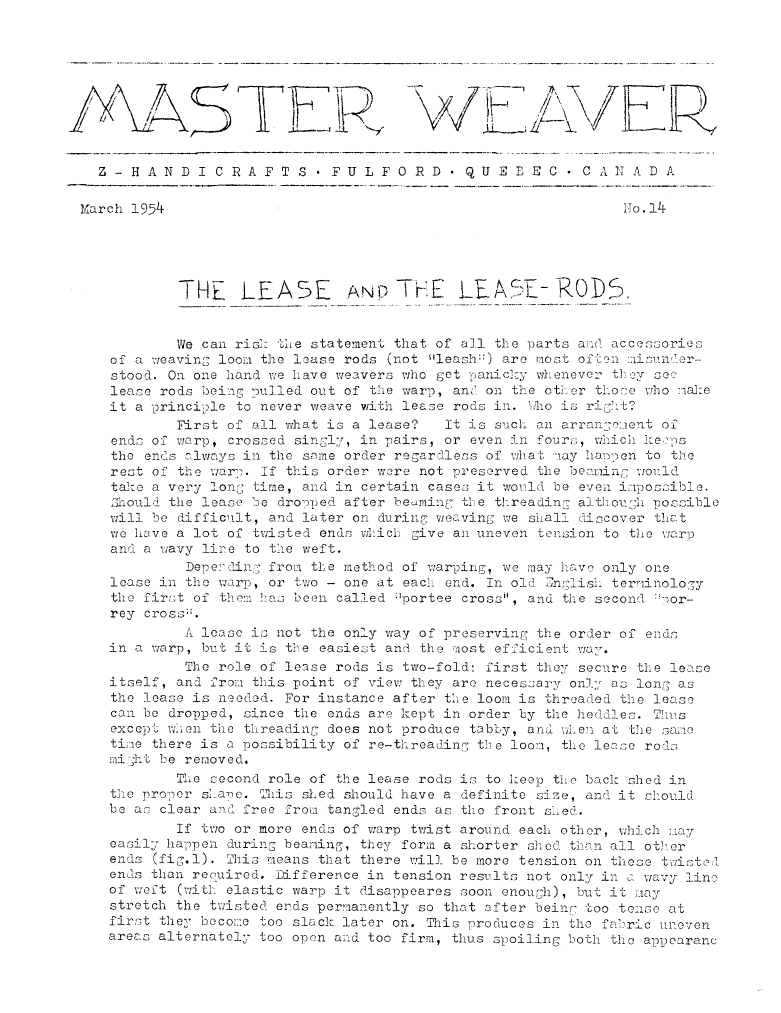 Weaving Terminology - Lash, Leash, Lease, ---. Master Weaver, No. 8 March 1953, 1 page. Note: PDF provided by Judith Combs. By permission. Posted July 15, 2006. SAMPLE PAGE. File size 494 KB PDF
