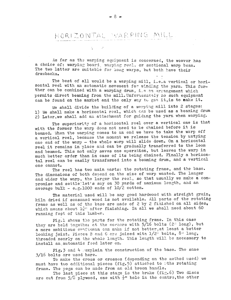 Horizontal Warping Mill - 1, ---. Master Weaver, No. 8 March 1953, 4 pages. Note: PDF provided by Judith Combs. By permission. Posted July 15, 2006. SAMPLE PAGE. File size 743 KB PDF