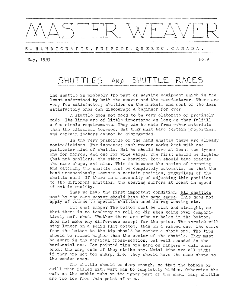 Shuttles and Shuttle-Races, ---. Master Weaver, No. 9 May 1953, 2 pages. Note: PDF provided by Judith Combs. By permission. Posted July 15, 2006. SAMPLE PAGE. File size 572 KB PDF