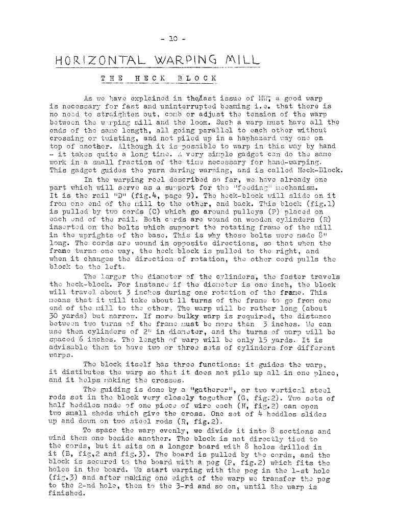 Horizontal Warping Mill 2 - The Heck Block, ---. Master Weaver, No. 9, May 1953, 3 pages. Note: PDF provided by Judith Combs. By permission. Posted July 15, 2006. SAMPLE PAGE. File size 694 KB PDF