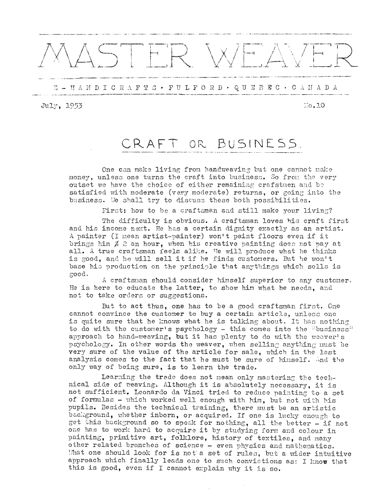 Craft or Business, ---. Master Weaver, No. 10 July 1953, 3 pages. Note: PDF provided by Judith Combs. By permission. Posted July 15, 2006. SAMPLE PAGE. File size 782 KB PDF