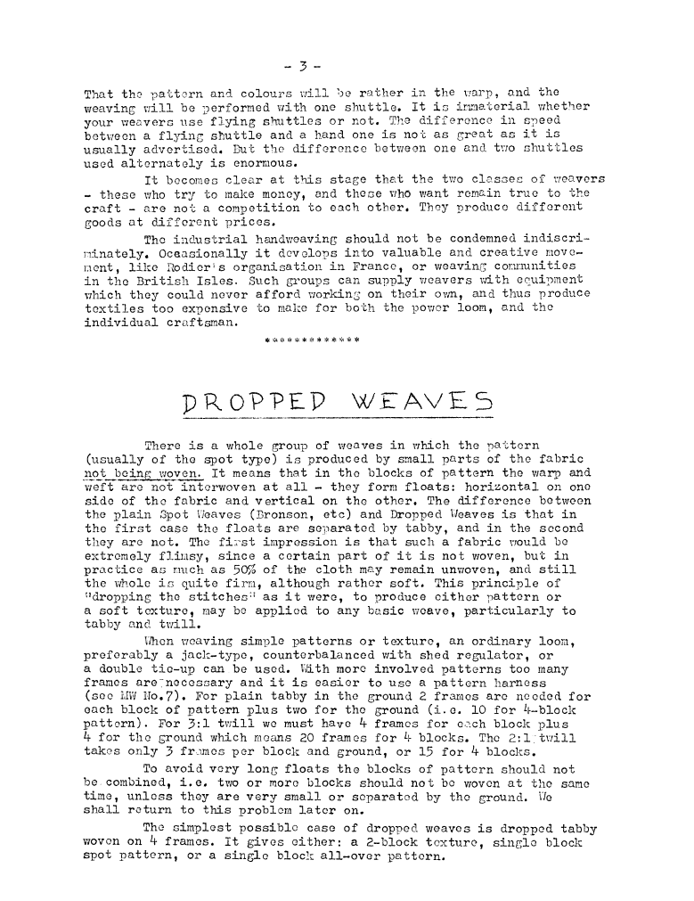 Dropped Weaves, ---. Master Weaver, No. 10 July 1953, 6 pages. Note: PDF provided by Judith Combs. By permission. Posted July 15, 2006. SAMPLE PAGE. File size 1 MB PDF
