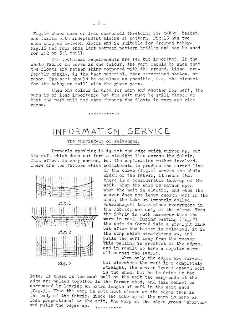 Information Service - The Curving Up of Selvages, ---. Master Weaver, No. 10 July 1953, 1 page. Note: PDF provided by Judith Combs. By permission. Posted July 15, 2006. SAMPLE PAGE. File size 491 KB PDF