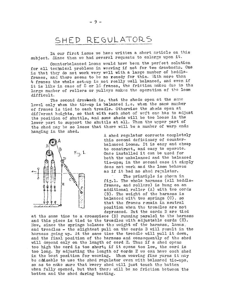 Shed Regulators on Counter-Balanced Looms, ---. Master Weaver, No. 1 December 1951, 1 page. Note: PDF provided by Judith Combs. By permission. Posted July 15, 2006. SAMPLE PAGE. File size 477 KB PDF