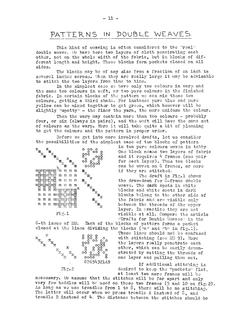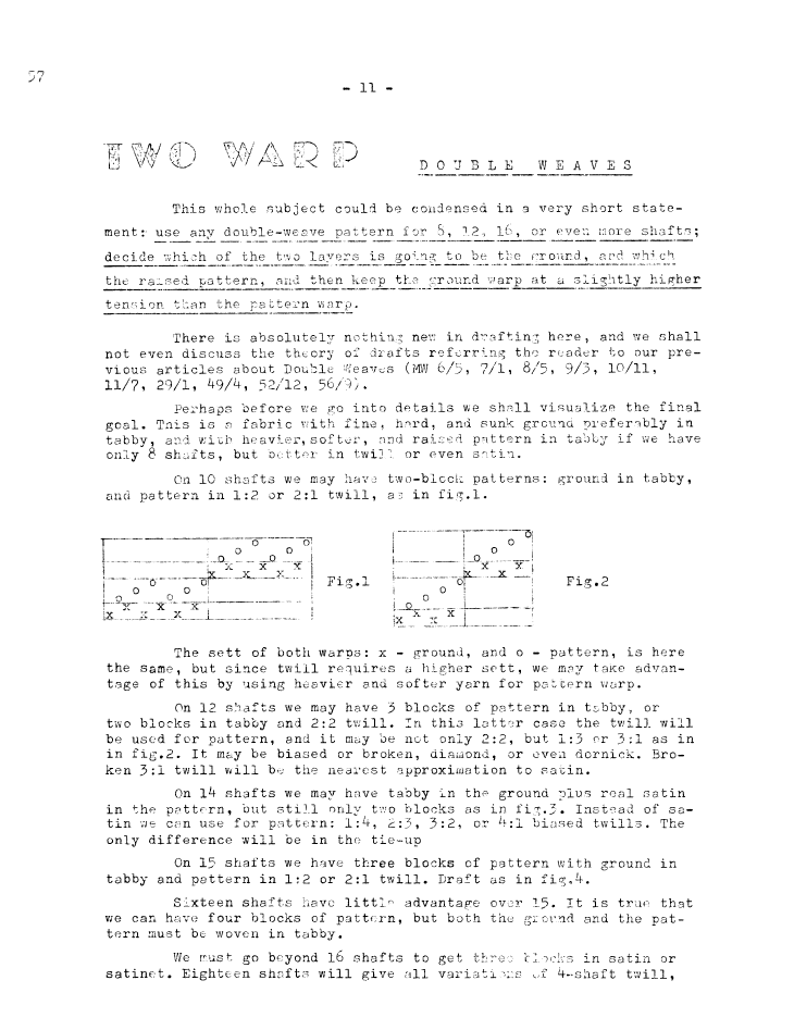 Double Weaves - Multi-Block Patterns, ---. Master Weaver, No. 11 September 1953, 4 pages. Note: PDF provided by Judith Combs. By permission. Posted July 15, 2006. SAMPLE PAGE. File size 716 KB PDF