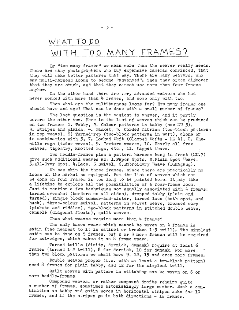 What To Do With Too Many Frames?, ---. Master Weaver, No. 11 September 1953, 4 pages. Note: PDF provided by Judith Combs. By permission. Posted July 15, 2006. SAMPLE PAGE. File size 711 KB PDF