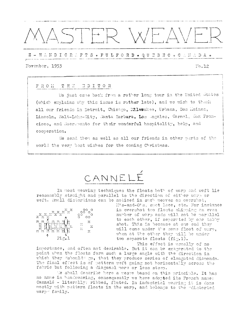 Cannelé, ---. Master Weaver, No. 12 November 1953, 2 pages. Note: PDF provided by Judith Combs. By permission. Posted July 15, 2006. SAMPLE PAGE. File size 590 KB PDF